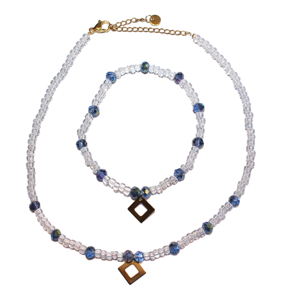 Bijna doorzichtige kralen, aangevuld met lichtblauwe facetkralen geven het koele gevoel van de winter mee. De gouden ruit zorgt voor een mooie warme tegenhanger.